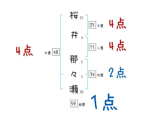 天運![]() | 桜井那々瀬さんの天運は25画の4つ星!個性があり才能があふれる。強運の持ち主で発展する。 家系が持つ宿命的な運勢を表します。祖先から受け継いだ苗字ですので自分の力が及びません。家柄を象徴します。 |
