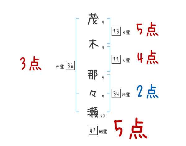 総運![]() | 茂木那々瀬さんの総運は47画の5つ星!実力が開花し発展する円満な人生。財に恵まれる。 あなたの人生を表す1番重要な運勢です。生涯を通じて影響する総合運となり、主に50歳以降の晩年期に影響を及ぼします。 |