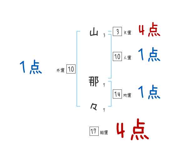 天運![]() | 山那々さんの天運は3画の4つ星!活動的で才能に恵まれ、多くの信頼を得る。希望に満ち成長する。 家系が持つ宿命的な運勢を表します。祖先から受け継いだ苗字ですので自分の力が及びません。家柄を象徴します。 |