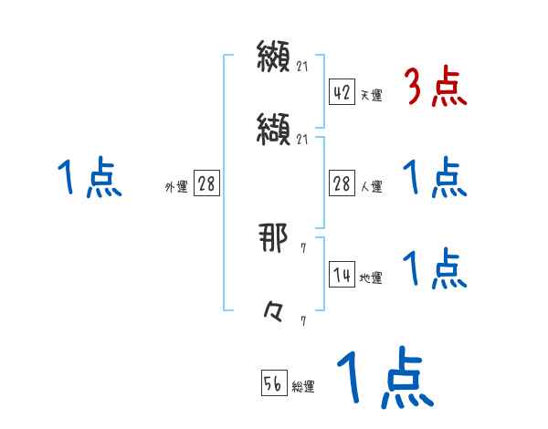 総運![]() | 纐纈那々さんの総運は56画の1つ星!消極的で無気力になりがち。誠実な気持ちが必要でしょう。 あなたの人生を表す1番重要な運勢です。生涯を通じて影響する総合運となり、主に50歳以降の晩年期に影響を及ぼします。 |