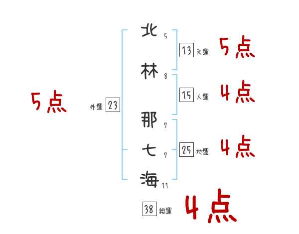 天運![]() | 北林那七海さんの天運は13画の5つ星!才能に恵まれ人気がある。名声を手に入れる。円満な人生。 家系が持つ宿命的な運勢を表します。祖先から受け継いだ苗字ですので自分の力が及びません。家柄を象徴します。 |