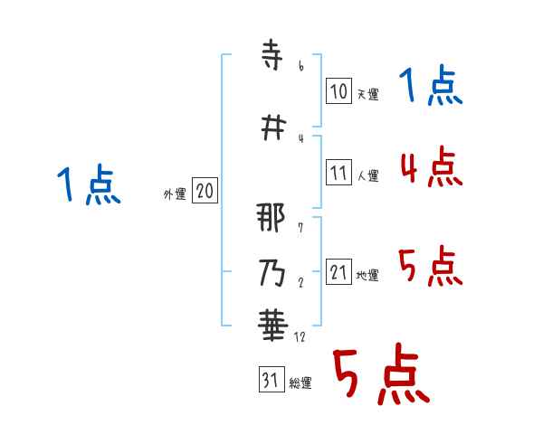 天運![]() | 寺井那乃華さんの天運は10画の1つ星!不安を感じやすい傾向。ストレスを抱えないように注意しましょう。 家系が持つ宿命的な運勢を表します。祖先から受け継いだ苗字ですので自分の力が及びません。家柄を象徴します。 |