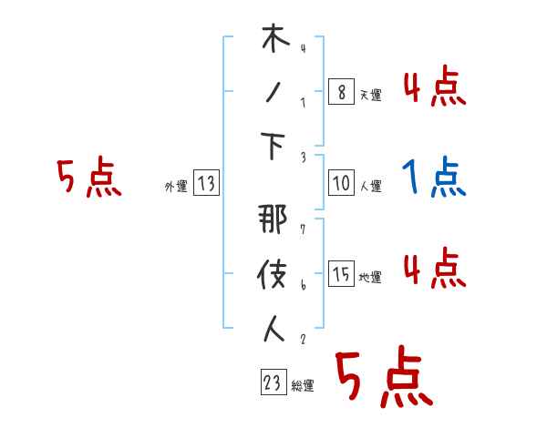 地運![]() | 木ノ下那伎人さんの地運は15画の4つ星!人徳があり出世する。順調に物事を進め円満な人生。 個性を表す基礎的な運勢です。性格形成や対人関係、行動力など家庭環境に影響されます。主に誕生してから20歳くらいまでの若年期の運勢を表します。 |
