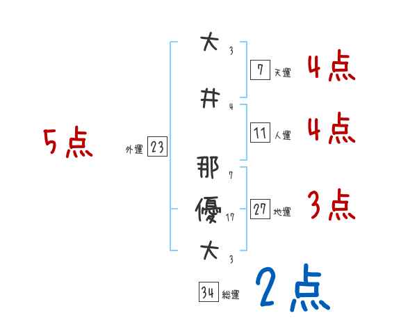 総運![]() | 大井那優大さんの総運は34画の2つ星!独創性に優れるが、自尊心が強く災難に注意しましょう。 あなたの人生を表す1番重要な運勢です。生涯を通じて影響する総合運となり、主に50歳以降の晩年期に影響を及ぼします。 |