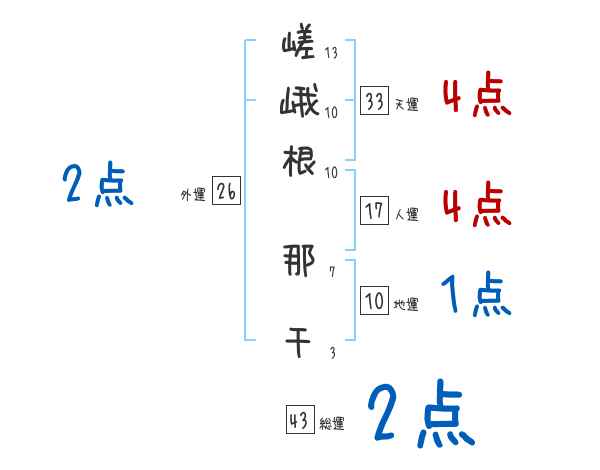 総運![]() | 嵯峨根那千さんの総運は43画の2つ星!頑固な性格で独立心が強いかも。やや非現実的で浪費に注意しましょう。 あなたの人生を表す1番重要な運勢です。生涯を通じて影響する総合運となり、主に50歳以降の晩年期に影響を及ぼします。 |