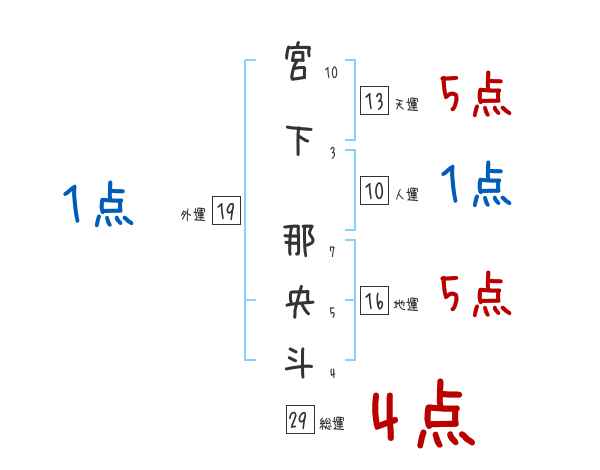 宮下那央斗さんの画数の鑑定結果