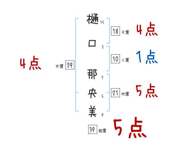 外運![]() | 樋口那央美さんの外運は29画の4つ星!完全主義で才能がある。厳格な心の持ち主。 生活面を象徴する運勢です。外部から受ける影響力を表し、結婚運、家庭運や職場、環境への順応性を表します。 |