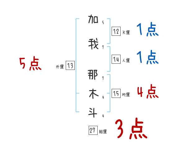 外運![]() | 加我那木斗さんの外運は13画の5つ星!才能に恵まれ人気がある。名声を手に入れる。円満な人生。 生活面を象徴する運勢です。外部から受ける影響力を表し、結婚運、家庭運や職場、環境への順応性を表します。 |