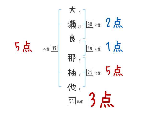 総運![]() | 大瀬良那柚他さんの総運は51画の3つ星!変化が激しく、危険に注意。堅実な性格。 あなたの人生を表す1番重要な運勢です。生涯を通じて影響する総合運となり、主に50歳以降の晩年期に影響を及ぼします。 |