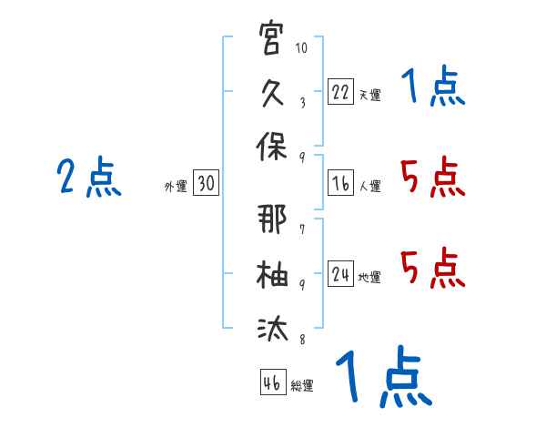 総運![]() | 宮久保那柚汰さんの総運は46画の1つ星!迷走することが多く苦労するかも。目先のことにとらわれないように。 あなたの人生を表す1番重要な運勢です。生涯を通じて影響する総合運となり、主に50歳以降の晩年期に影響を及ぼします。 |