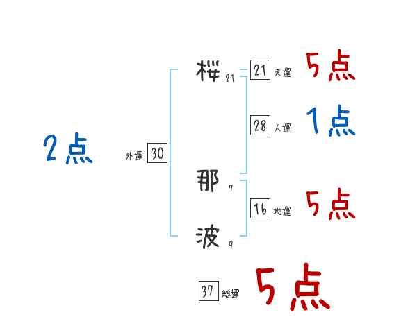 天運![]() | 桜那波さんの天運は21画の5つ星!統率力がある。独立し成功する。名誉を手に入れる。 家系が持つ宿命的な運勢を表します。祖先から受け継いだ苗字ですので自分の力が及びません。家柄を象徴します。 |