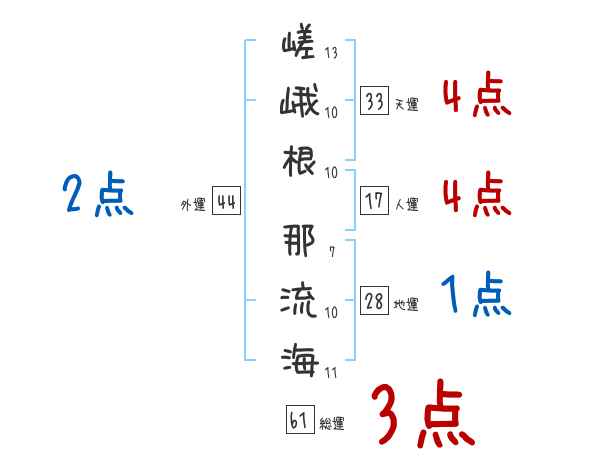 総運![]() | 嵯峨根那流海さんの総運は61画の3つ星!強情な性格でうぬぼれタイプ。自ら破滅する。 あなたの人生を表す1番重要な運勢です。生涯を通じて影響する総合運となり、主に50歳以降の晩年期に影響を及ぼします。 |