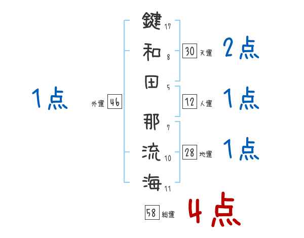総運![]() | 鍵和田那流海さんの総運は58画の4つ星!安定した生活。大器晩成タイプ。 あなたの人生を表す1番重要な運勢です。生涯を通じて影響する総合運となり、主に50歳以降の晩年期に影響を及ぼします。 |