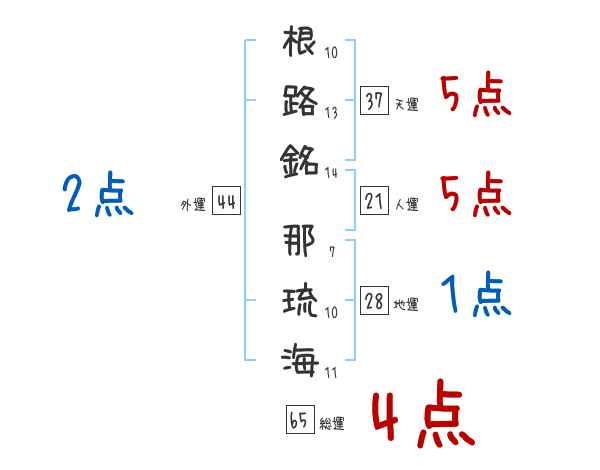 総運![]() | 根路銘那琉海さんの総運は65画の4つ星!幸運に恵まれ繁栄する。包容力がある。 あなたの人生を表す1番重要な運勢です。生涯を通じて影響する総合運となり、主に50歳以降の晩年期に影響を及ぼします。 |