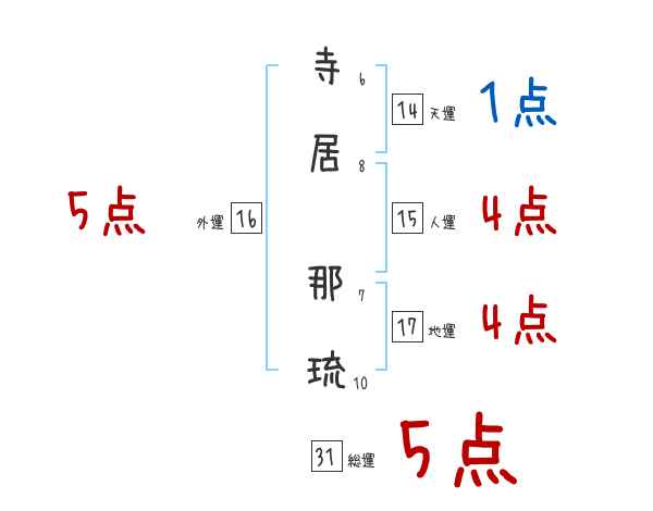 天運![]() | 寺居那琉さんの天運は14画の1つ星!人に対して優しいがストレスを溜め込みがち。人間関係のトラブルを避けるよう気をつけましょう。 家系が持つ宿命的な運勢を表します。祖先から受け継いだ苗字ですので自分の力が及びません。家柄を象徴します。 |