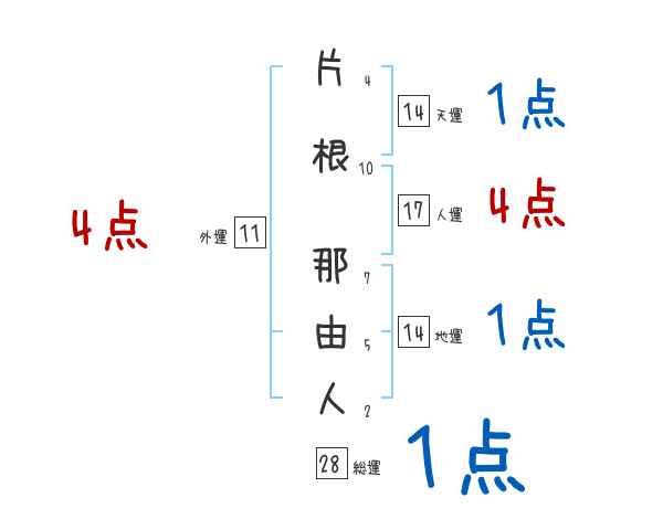 総運![]() | 片根那由人さんの総運は28画の1つ星!家庭環境に注意。スポーツで活躍できる能力があるかも。 あなたの人生を表す1番重要な運勢です。生涯を通じて影響する総合運となり、主に50歳以降の晩年期に影響を及ぼします。 |
