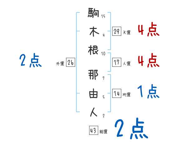 総運![]() | 駒木根那由人さんの総運は43画の2つ星!頑固な性格で独立心が強いかも。やや非現実的で浪費に注意しましょう。 あなたの人生を表す1番重要な運勢です。生涯を通じて影響する総合運となり、主に50歳以降の晩年期に影響を及ぼします。 |