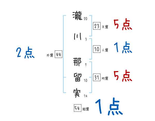 外運![]() | 瀧川那留実さんの外運は44画の2つ星!誠実で慎重な性格。物事を考えすぎないように注意しましょう。 生活面を象徴する運勢です。外部から受ける影響力を表し、結婚運、家庭運や職場、環境への順応性を表します。 |
