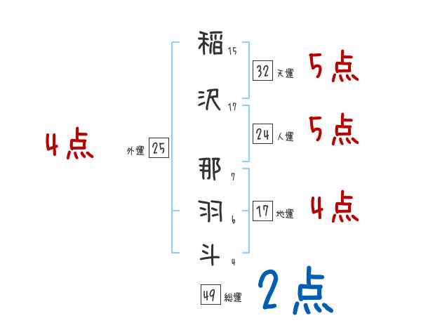 天運![]() | 稲沢那羽斗さんの天運は32画の5つ星!柔軟性があり成功する。チャンスが多く金運が良い。 家系が持つ宿命的な運勢を表します。祖先から受け継いだ苗字ですので自分の力が及びません。家柄を象徴します。 |
