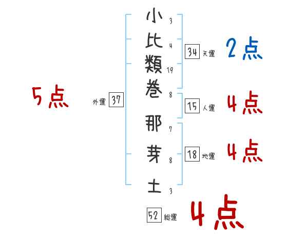 外運![]() | 小比類巻那芽土さんの外運は37画の5つ星!努力家で順応性に優れる。現実的な考え方ができ忠実に物事をこなす。 生活面を象徴する運勢です。外部から受ける影響力を表し、結婚運、家庭運や職場、環境への順応性を表します。 |