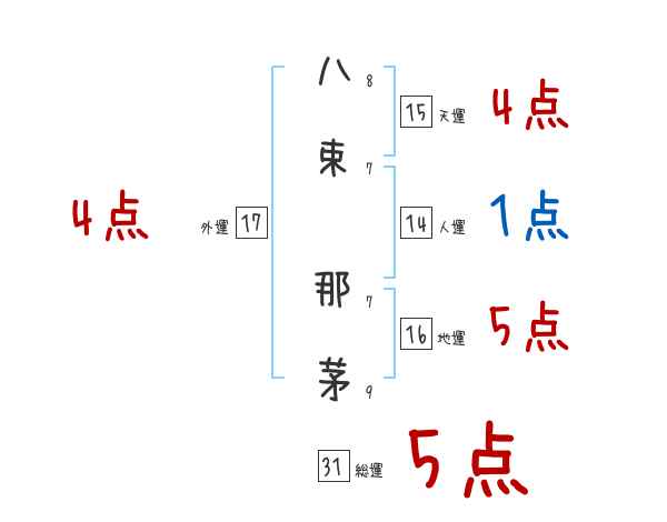 天運![]() | 八束那茅さんの天運は15画の4つ星!人徳があり出世する。順調に物事を進め円満な人生。 家系が持つ宿命的な運勢を表します。祖先から受け継いだ苗字ですので自分の力が及びません。家柄を象徴します。 |