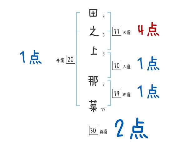 天運![]() | 田之上那菜さんの天運は11画の4つ星!着実に富や地位を得る幸運な人生。 家系が持つ宿命的な運勢を表します。祖先から受け継いだ苗字ですので自分の力が及びません。家柄を象徴します。 |