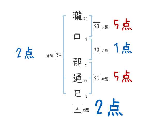 人運![]() | 瀧口那通巳さんの人運は10画の1つ星!不安を感じやすい傾向。ストレスを抱えないように注意しましょう。 性格や才能などを表す2番目に重要な運勢です。人間関係や協調性、社会的な成功に影響します。主に20歳から50歳ぐらいまでの中年期の運勢を表します。 |
