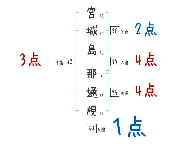 天運![]() | 宮城島那通規さんの天運は30画の2つ星!浮き沈みの激しさに注意しましょう。 家系が持つ宿命的な運勢を表します。祖先から受け継いだ苗字ですので自分の力が及びません。家柄を象徴します。 |