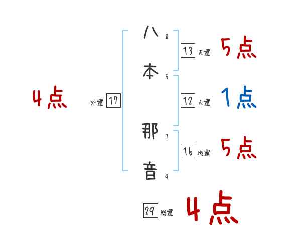 天運![]() | 八本那音さんの天運は13画の5つ星!才能に恵まれ人気がある。名声を手に入れる。円満な人生。 家系が持つ宿命的な運勢を表します。祖先から受け継いだ苗字ですので自分の力が及びません。家柄を象徴します。 |