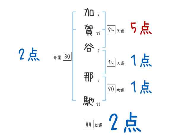 天運![]() | 加賀谷那馳さんの天運は24画の5つ星!家庭運が良く順調な人生。金運にも恵まれる。 家系が持つ宿命的な運勢を表します。祖先から受け継いだ苗字ですので自分の力が及びません。家柄を象徴します。 |
