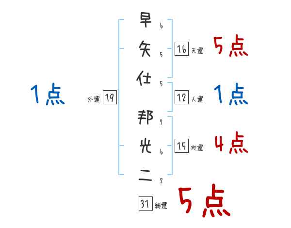 天運![]() | 早矢仕邦光二さんの天運は16画の5つ星!人望が厚く大きく発展する。逆転成功が見える。 家系が持つ宿命的な運勢を表します。祖先から受け継いだ苗字ですので自分の力が及びません。家柄を象徴します。 |