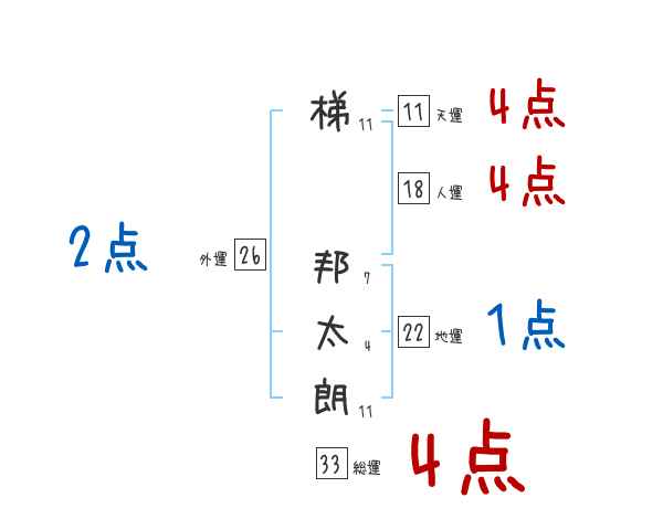 天運![]() | 梯邦太朗さんの天運は11画の4つ星!着実に富や地位を得る幸運な人生。 家系が持つ宿命的な運勢を表します。祖先から受け継いだ苗字ですので自分の力が及びません。家柄を象徴します。 |