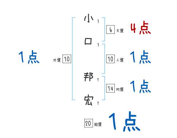 天運![]() | 小口邦宏さんの天運は6画の4つ星!慎重な努力家で信頼を得る。誠実な精神で向上心に優れる。 家系が持つ宿命的な運勢を表します。祖先から受け継いだ苗字ですので自分の力が及びません。家柄を象徴します。 |