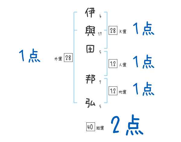 天運![]() | 伊與田邦弘さんの天運は28画の1つ星!家庭環境に注意。スポーツで活躍できる能力があるかも。 家系が持つ宿命的な運勢を表します。祖先から受け継いだ苗字ですので自分の力が及びません。家柄を象徴します。 |