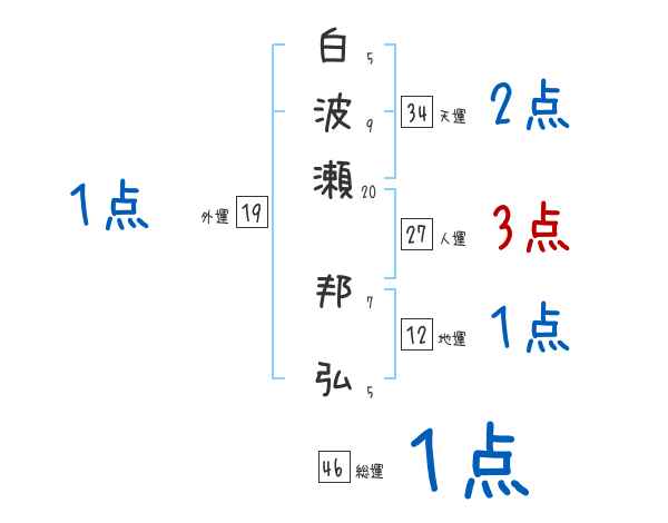 外運![]() | 白波瀬邦弘さんの外運は19画の1つ星!優れた才能を持ちますが、協調性が足りないことも。周りの人と協力する事を意識しましょう。 生活面を象徴する運勢です。外部から受ける影響力を表し、結婚運、家庭運や職場、環境への順応性を表します。 |