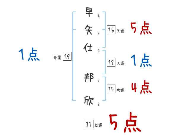 天運![]() | 早矢仕邦欣さんの天運は16画の5つ星!人望が厚く大きく発展する。逆転成功が見える。 家系が持つ宿命的な運勢を表します。祖先から受け継いだ苗字ですので自分の力が及びません。家柄を象徴します。 |