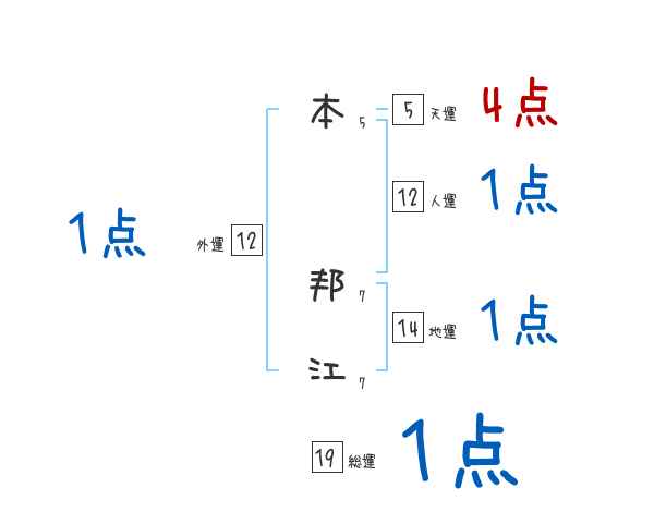 天運![]() | 本邦江さんの天運は5画の4つ星!健康で安泰。協調性に優れ、財産に恵まれる。 家系が持つ宿命的な運勢を表します。祖先から受け継いだ苗字ですので自分の力が及びません。家柄を象徴します。 |