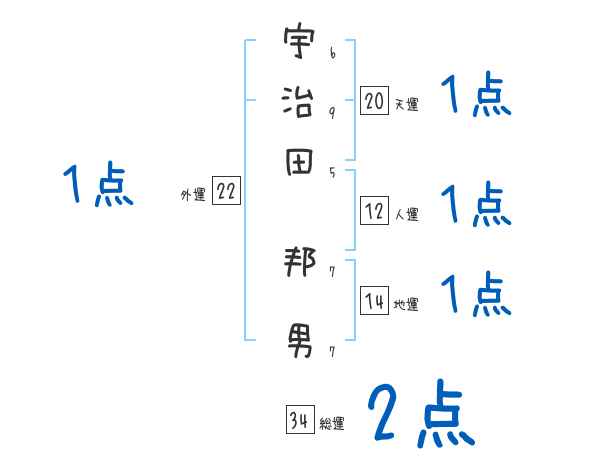 総運![]() | 宇治田邦男さんの総運は34画の2つ星!独創性に優れるが、自尊心が強く災難に注意しましょう。 あなたの人生を表す1番重要な運勢です。生涯を通じて影響する総合運となり、主に50歳以降の晩年期に影響を及ぼします。 |