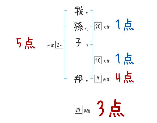 外運![]() | 我孫子邦さんの外運は24画の5つ星!家庭運が良く順調な人生。金運にも恵まれる。 生活面を象徴する運勢です。外部から受ける影響力を表し、結婚運、家庭運や職場、環境への順応性を表します。 |