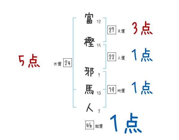 天運![]() | 富樫邪馬人さんの天運は27画の3つ星!頭脳明晰だが強情で摩擦が多い傾向。孤立に注意。 家系が持つ宿命的な運勢を表します。祖先から受け継いだ苗字ですので自分の力が及びません。家柄を象徴します。 |