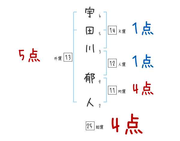 総運![]() | 宇田川郁人さんの総運は25画の4つ星!個性があり才能があふれる。強運の持ち主で発展する。 あなたの人生を表す1番重要な運勢です。生涯を通じて影響する総合運となり、主に50歳以降の晩年期に影響を及ぼします。 |