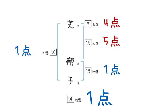 天運![]() | 芝郁子さんの天運は7画の4つ星!強い意志や信念を持ち独立心が強い。自立する。 家系が持つ宿命的な運勢を表します。祖先から受け継いだ苗字ですので自分の力が及びません。家柄を象徴します。 |