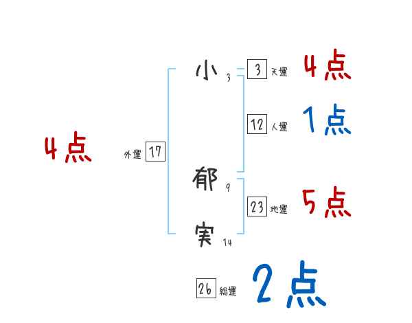 外運![]() | 小郁実さんの外運は17画の4つ星!積極的な行動力。地位を気づき財産を手に入れる。純粋な心と直感力。 生活面を象徴する運勢です。外部から受ける影響力を表し、結婚運、家庭運や職場、環境への順応性を表します。 |