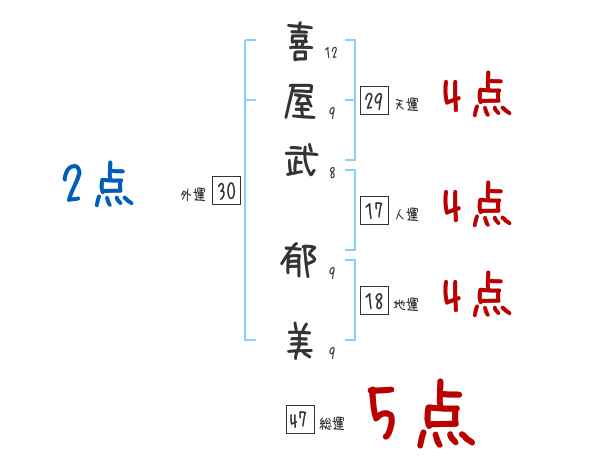 天運![]() | 喜屋武郁美さんの天運は29画の4つ星!完全主義で才能がある。厳格な心の持ち主。 家系が持つ宿命的な運勢を表します。祖先から受け継いだ苗字ですので自分の力が及びません。家柄を象徴します。 |