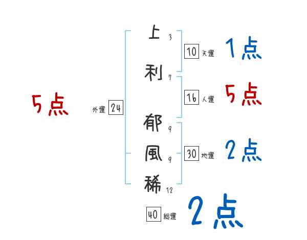 | 外運  | 上利郁風稀さんの外運は24画の5つ星!家庭運が良く順調な人生。金運にも恵まれる。生活面を象徴する運勢です。外部から受ける影響力を表し、結婚運、家庭運や職場、環境への順応性を表します。 |