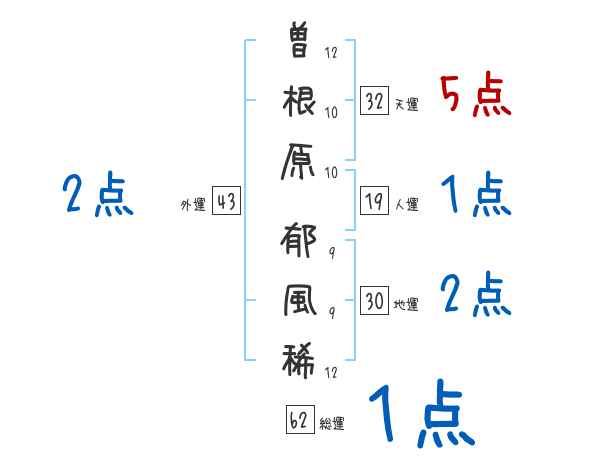 天運![]() | 曽根原郁風稀さんの天運は32画の5つ星!柔軟性があり成功する。チャンスが多く金運が良い。 家系が持つ宿命的な運勢を表します。祖先から受け継いだ苗字ですので自分の力が及びません。家柄を象徴します。 |