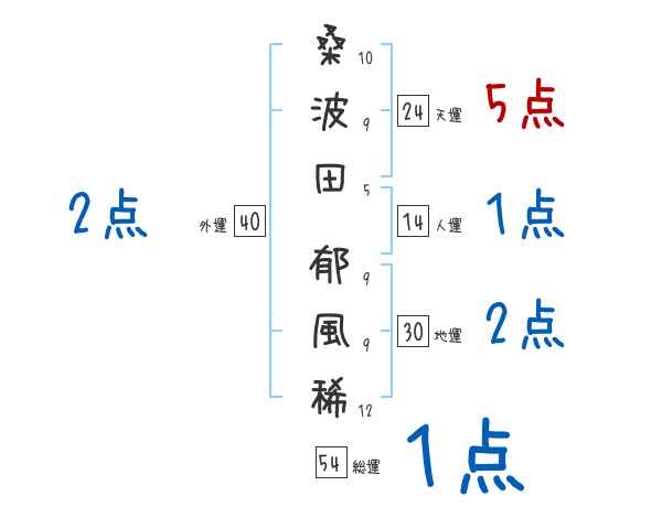 総運![]() | 桑波田郁風稀さんの総運は54画の1つ星!トラブルが多いかも。周りをよく見て協調して過ごしましょう。 あなたの人生を表す1番重要な運勢です。生涯を通じて影響する総合運となり、主に50歳以降の晩年期に影響を及ぼします。 |