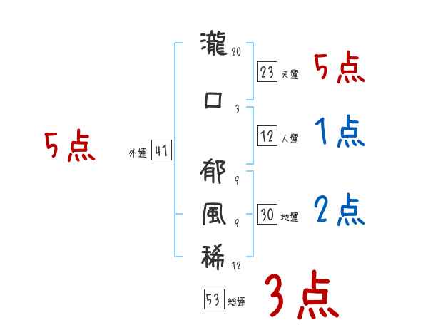 | 天運  | 瀧口郁風稀さんの天運は23画の5つ星!想像力に優れ活力がある。一代で成功し名誉を手に入れる。家系が持つ宿命的な運勢を表します。祖先から受け継いだ苗字ですので自分の力が及びません。家柄を象徴します。 |