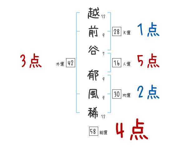 外運![]() | 越前谷郁風稀さんの外運は42画の3つ星!病気に注意。多芸であるが消極的でおとなしい。 生活面を象徴する運勢です。外部から受ける影響力を表し、結婚運、家庭運や職場、環境への順応性を表します。 |