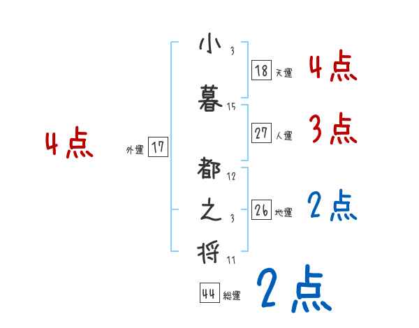 外運![]() | 小暮都之将さんの外運は17画の4つ星!積極的な行動力。地位を気づき財産を手に入れる。純粋な心と直感力。 生活面を象徴する運勢です。外部から受ける影響力を表し、結婚運、家庭運や職場、環境への順応性を表します。 |